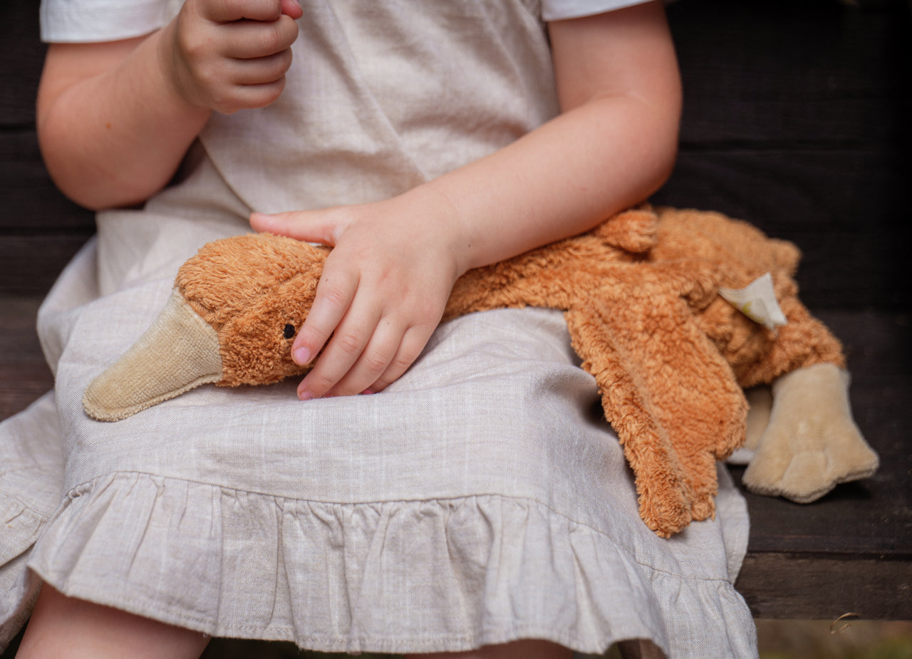 Whether used as a cozy cuddle companion, a warming pillow on chilly evenings, or simply a comforting friend, this special goose brings warmth and character to everyday life. Its thoughtful craftsmanship and natural materials make it a timeless piece that can accompany children for many years.